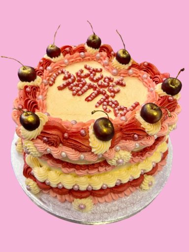 Our retro style is fast becoming our most popular cake style! Vintage style piping around the cakes, with different styles of piping to create a kitsch, romantic and fun design.
