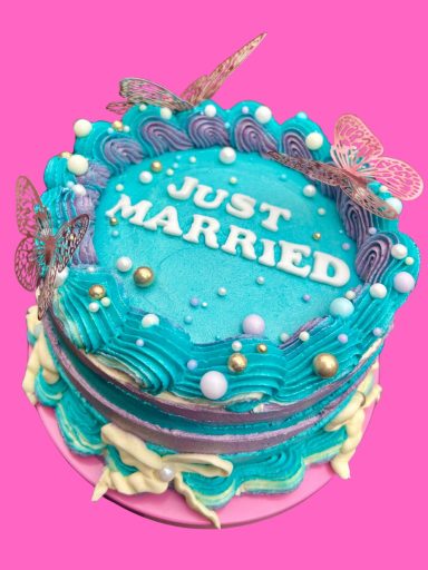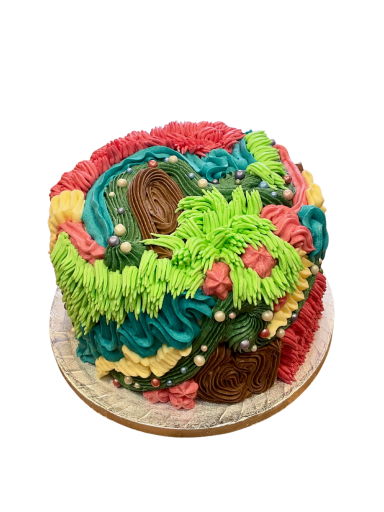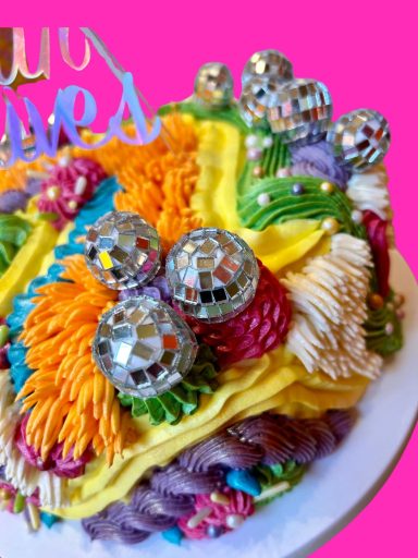The life of the party in cake form! Our Disco style is a perfect centre piece to your celebration. Mixing a range of different piping techniques with vibrant colours, this style is eye catching and fun.
