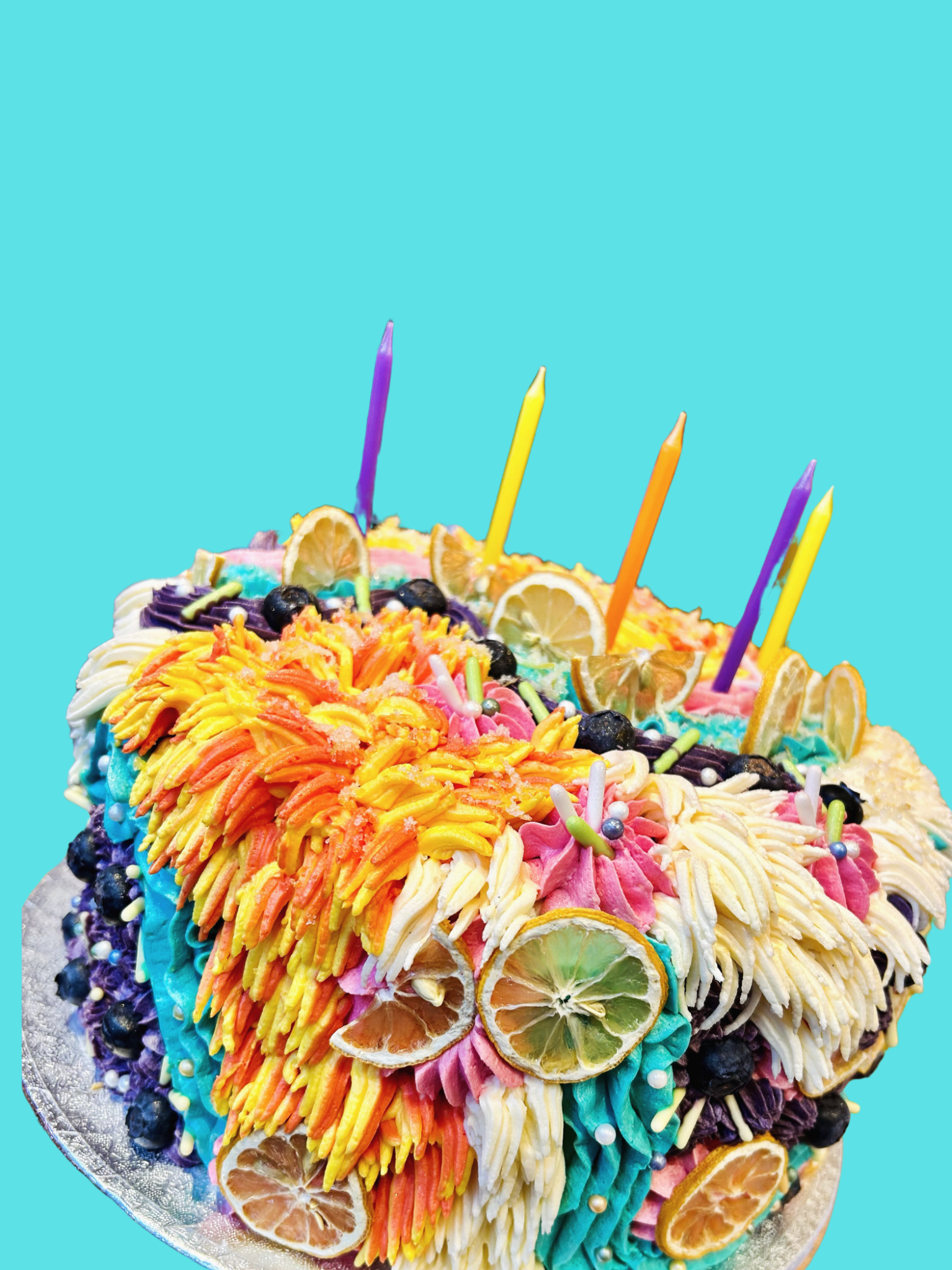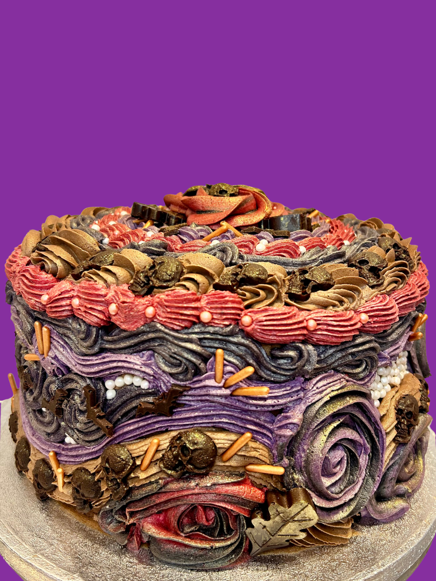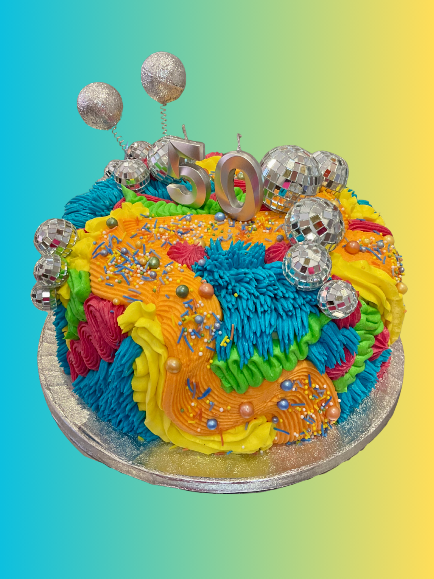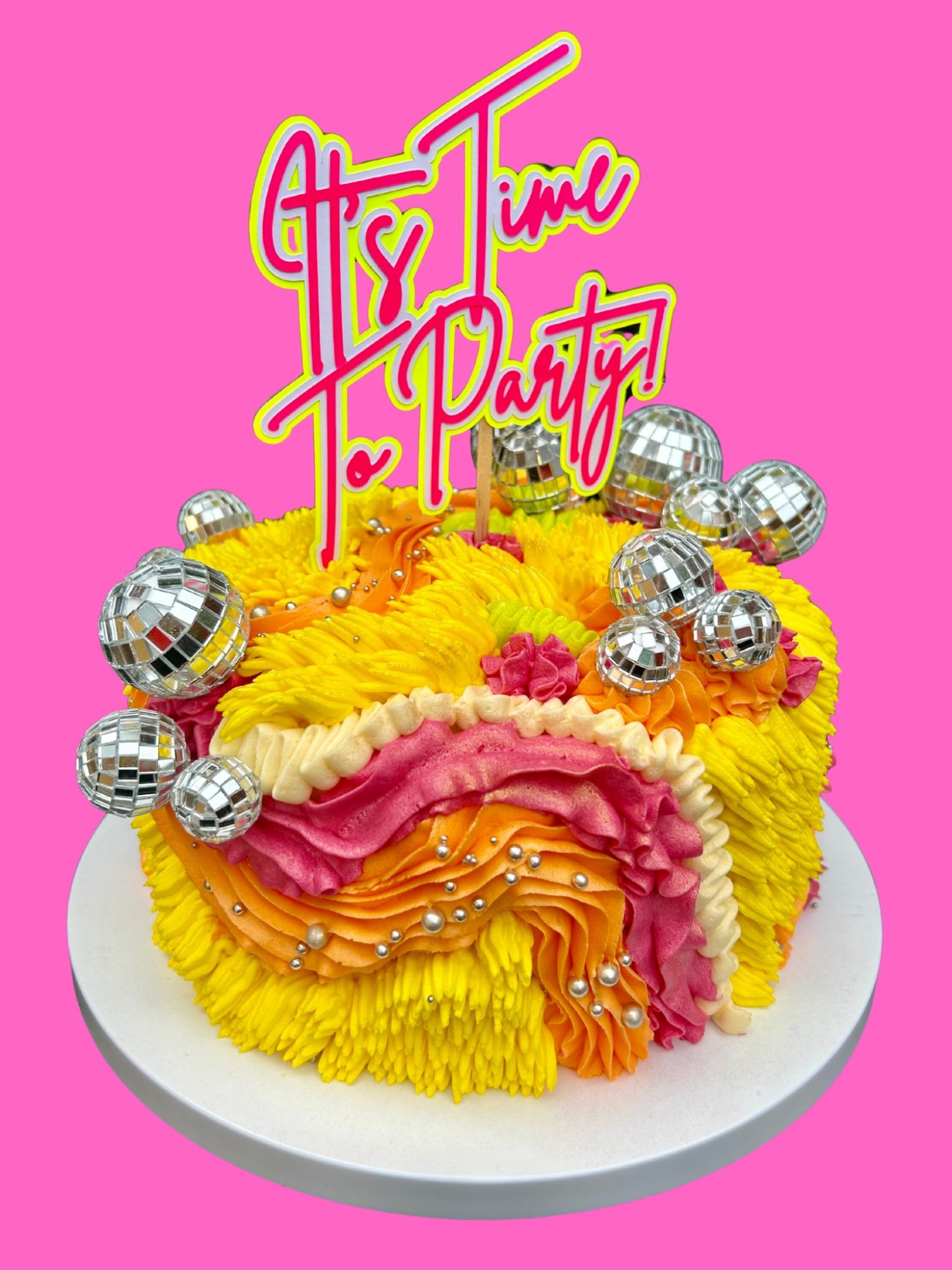 The life of the party in cake form! Our Disco style is a perfect centre piece to your celebration. Mixing a range of different piping techniques with vibrant colours, this style is eye catching and fun.