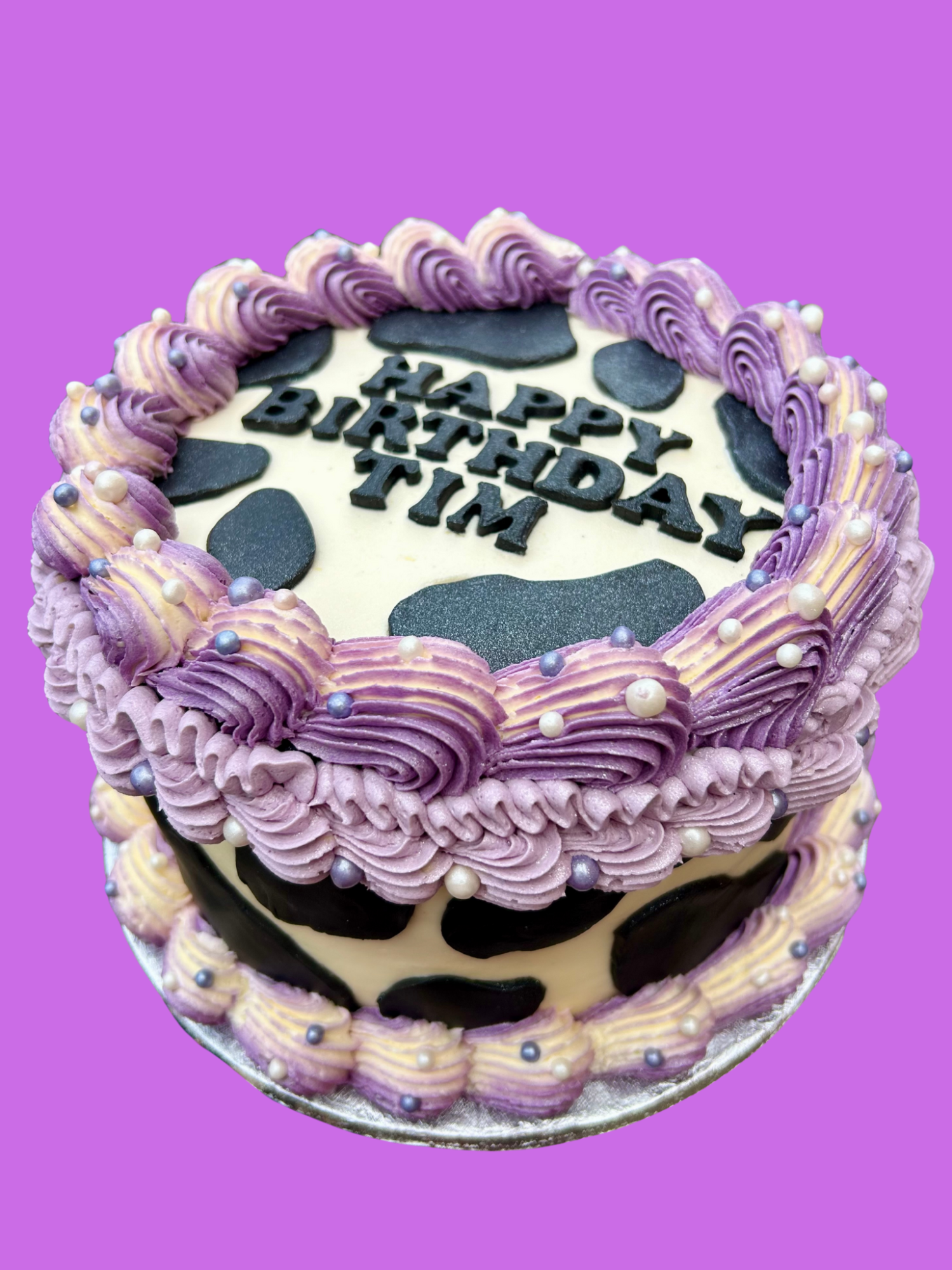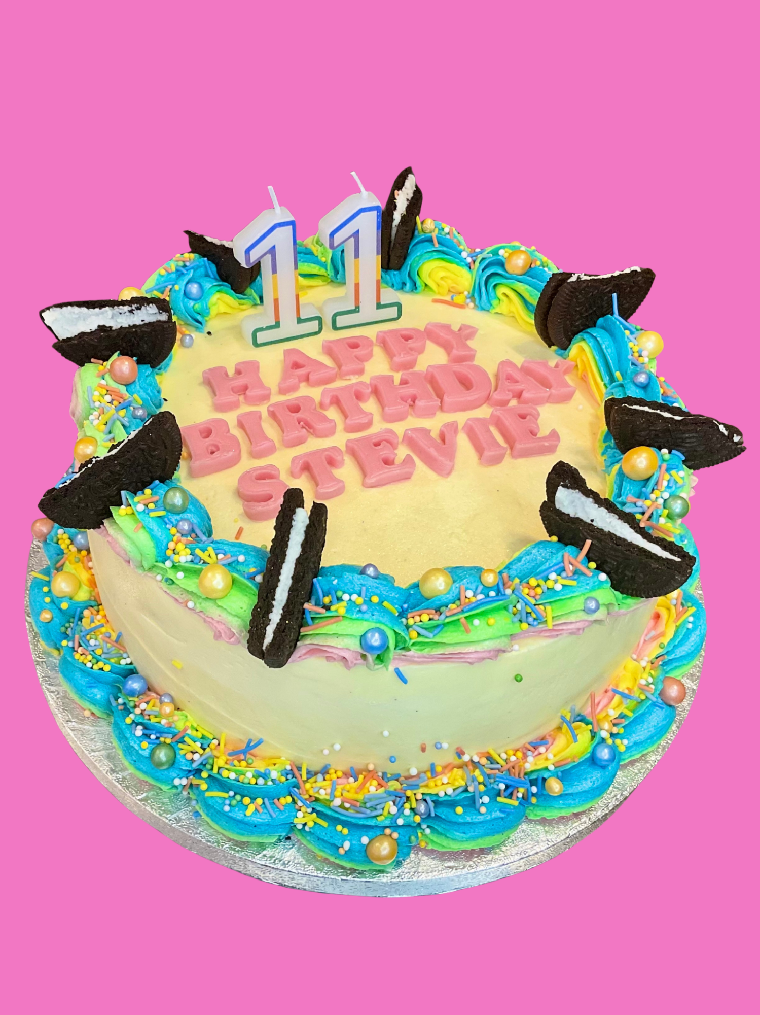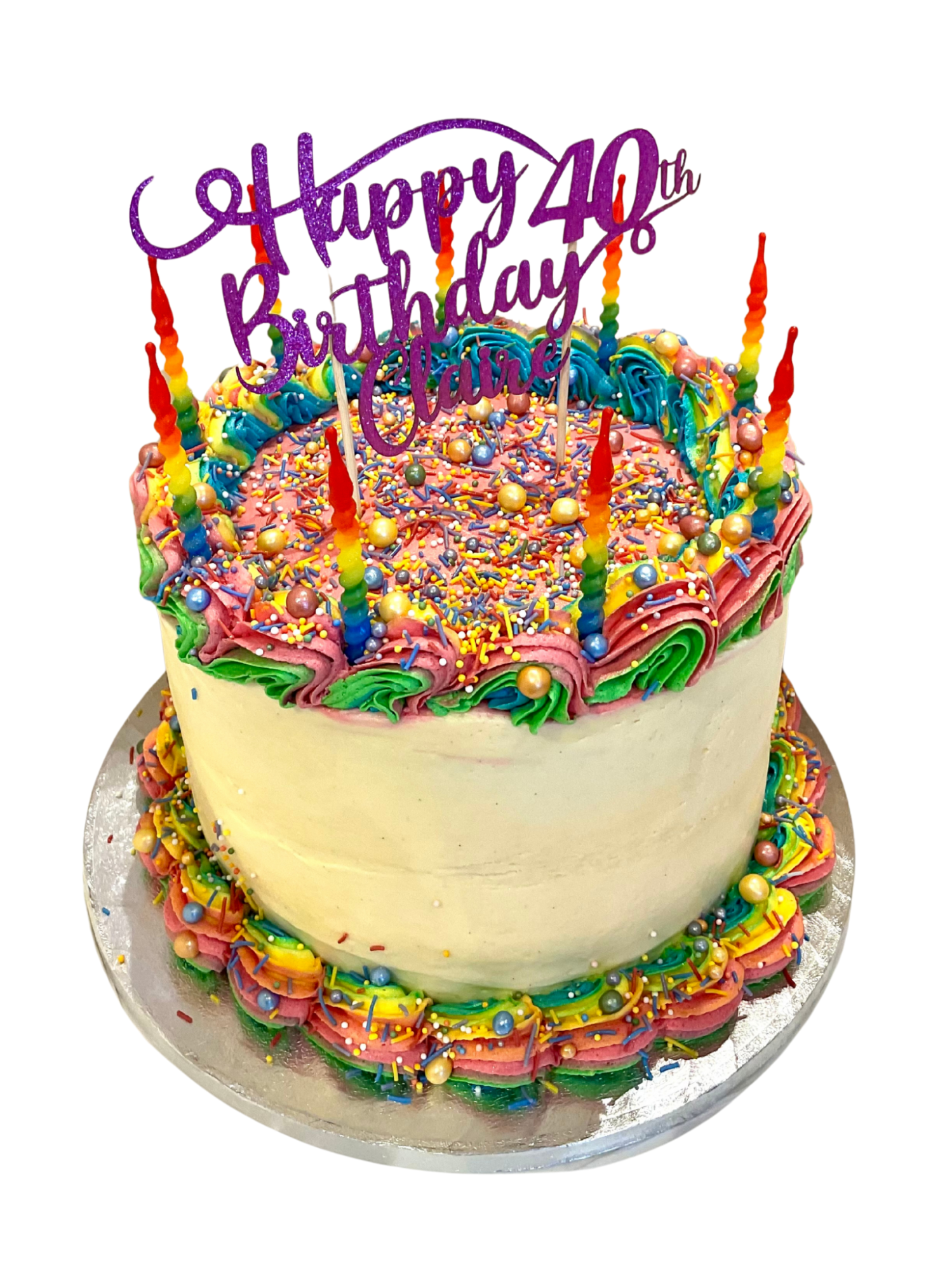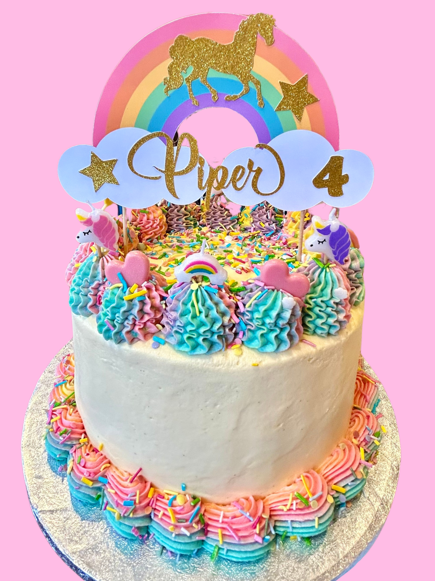 Our classic style cake is when you would like a simple but still a fun design. Decorated with frosting swirls, sprinkles and a card topper, and candles can be added.